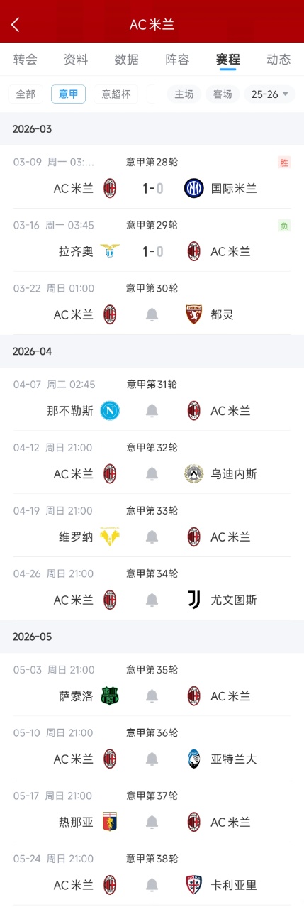 米兰剩余赛程: